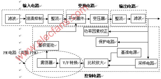根據(jù)控制類型不同,PM(脈沖調制)電路可能有多種形式。這里是典型的PFM結構。