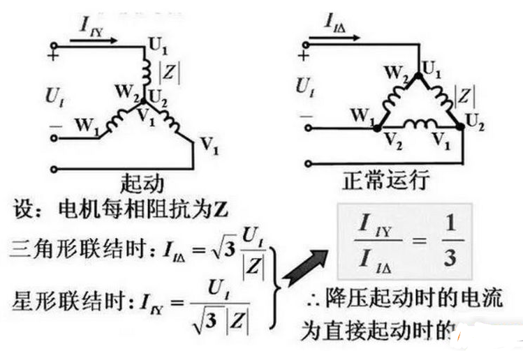 星三角降壓啟動需要三個接觸器,一個主電路接觸器,一個星啟動接觸器,一個三角形運行接觸器。最好用時間繼電器控制延時,另外主電路接觸器要加熱過載繼電器用來保護電機。星三角降壓啟動只適用于正常運行為三角形接線的電機。 首先我們看下電機的內部繞組,三相異步電機內部有三個繞組,有星和三角形兩種接法。 星型就是三個繞組的尾端連到一起,三角形是三個繞組首尾連接。 接線的時候要把這三個連接片去掉。 注意看主線部分的接線,最好用黃綠紅三色線。 從上圖我們可以看出,剛開始1號接觸器和3號接觸器同時吸合,由于三號接觸器上端是短接到一起的,三個點接為一點,這一個點連接電機的W2,U2,V2,正好是星型接法,這個點叫中性點。星型啟動降低了電壓,減小了電流,電機啟動很輕松。當啟動以后,3號接觸器斷開,2號接觸器吸合,1號是主電源接觸器,一直保持吸合狀態。1號接觸器和2號接觸器吸合以后,電機的三個繞組就成了三角形接法,電機就可以全電壓正常運行。 下面我們看下完整的接線。 這個就是完整的接線。 熱過載繼電器和主電源接觸器連接,三相相序相同,上圖黃綠紅為主線部分,黑色線為二次線控制線部分。 做星三角啟動的電機有兩個重要的特性:星型啟動電流和啟動轉矩均變成額定電流的三分之一。 可以看出啟動時電流很小。